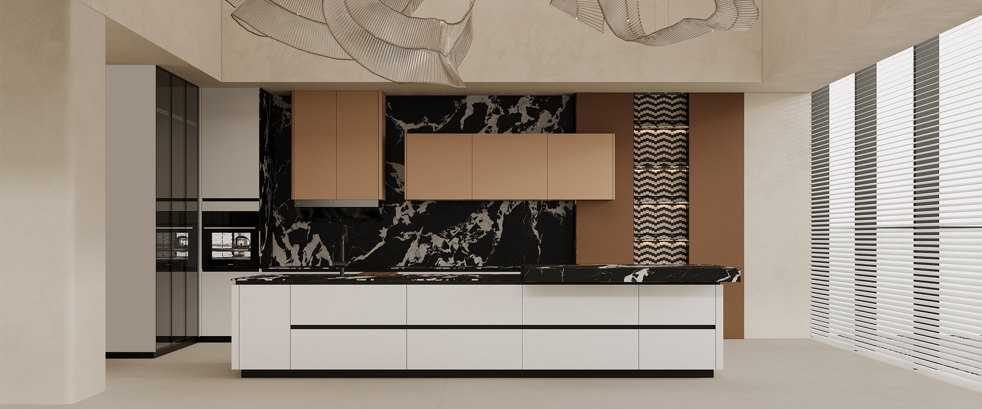 在厨柜设计中,地柜是采用抽拉方式,而吊柜采用的是平开方式,从设计美学来说,地柜是横线条,吊柜是竖线条,归纳为“地横吊竖